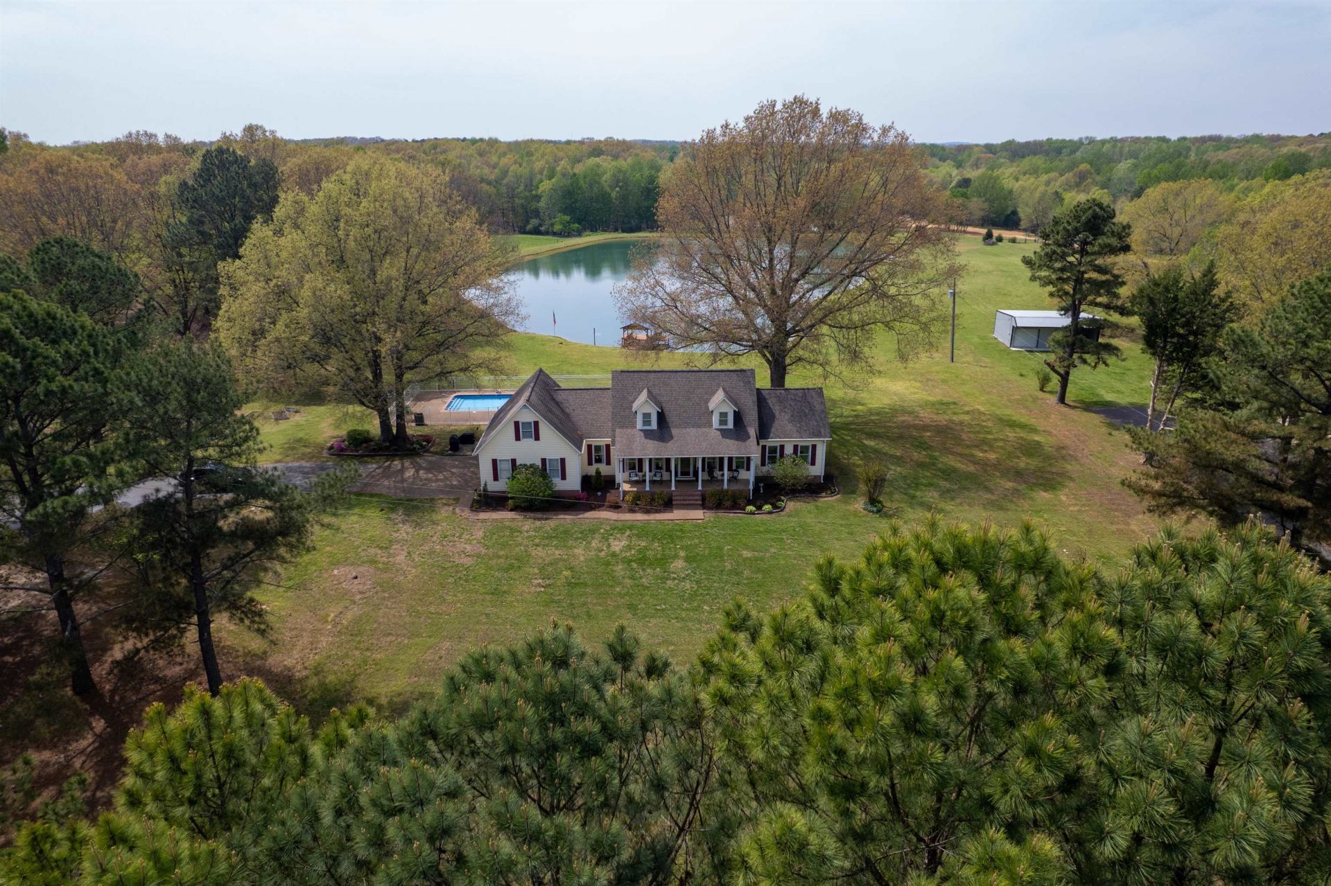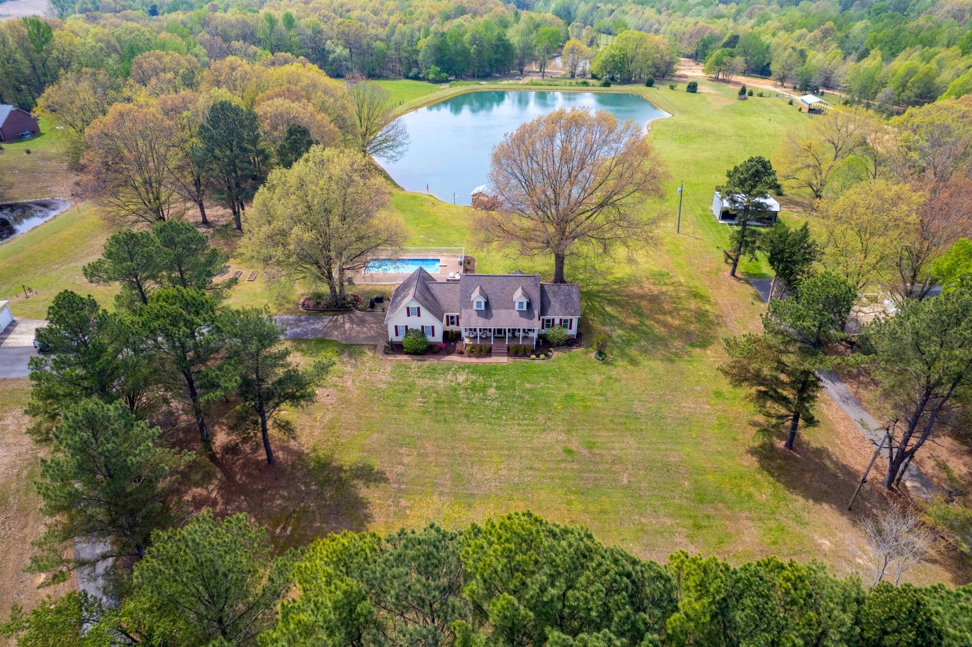 Beautiful setting on 9 acres. 4 BR 2.5BA home with stocked lake; inground pool, 4 bay detached workshop, outdoor courtyard patio with fireplace. Remodeled kitchen in 2025, updated master bath with stand alone tub and tile shower, double vanity walk in closet in master . Also on main level is a sunroom off the greatroom. 2 bedrooms upstairs with a 4th room (bonus, no closet ) with sep stairway. Enjoy fishing, swimming, workshop great for hobby, relaxing by the masonry outdoor fireplace or just sitting on the dock by the Lake enjoying sunsets. Nice front porch on the home also.